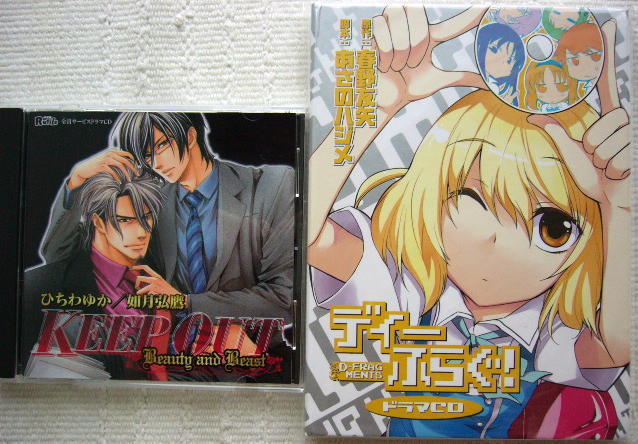 写真は「ディーふらぐ」と全サ「KEEP OUT」 「ディーふらぐ」は7月23日発売だったけれど とらのあな限定販売なので、夏コミ商品と一緒に買って 送料を浮かそうという魂胆でやっと届いて聴きました。 全サ「KEEP OUT」も締め切りが延期になってたので かなーり予定よりも発送が遅れましたね。 「ディーふらぐ」あまりの全員テンションが高くて ルチル全サCD「KEEP OUT Beauty an Beast」