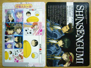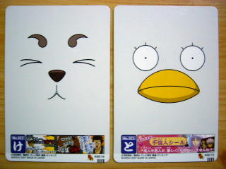 銀魂カードガム~シールカードもはじめました~ 3つ買って2枚がシールカードでした。 残り1枚は銀さんたちの魔流血頭ネタのものです。 シールはこんな、感じ。 写真が逆になったけど、定春の裏が真撰組で、エリーの裏がヅラ達。 こんなのばっかり買っちゃってねぇ・・・・・ キャスト